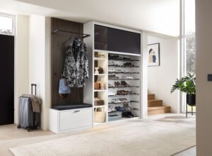 Garderoben-Set V-Lacera bestehend aus Kommode, Garderobenpaneel und Sitzbank mit Stoffbezug, in Wildeiche Vollholz geölt/ Lack olivgrau, bei Paneel mit Parsolspiegel links, Gesamtbreite ca. 192 cm, Mehrpreis für: Beleuchtung +185 € Klares Design und zeitgemäße Formen finden in jedem Zuhause ihren Platz. Massivholzmöbel von Voglauer fügen sich perfekt in offene Raumstrukturen ein und bilden architektonische Wohnqualitäten. In unserer…