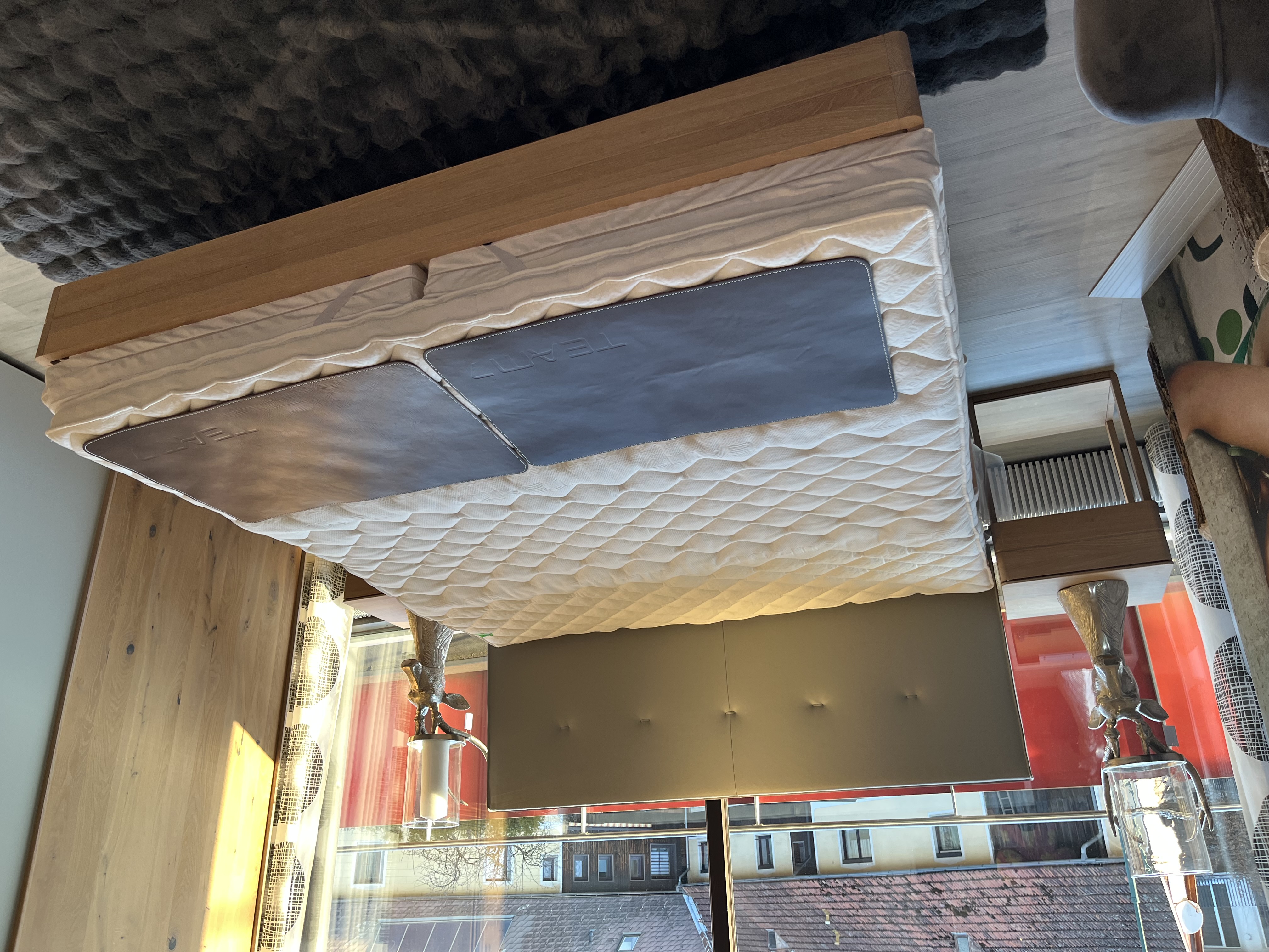 in Eiche Weiß geölt, mit Leder-Polsterhaupt in hellgrau, für 180 x 200 cm, Besttseitenhöhe 39,5 cm, 185 cm breit x 211,1 cm tief x 114,1 cm hoch, inkl. 2x Nachttisch FLOAT in Eiche Weiß geölt, mit einer Schublade, Holzkufen, je 45 cm breit, 1x 64,5 cm hoch und 1x 40,6 cm