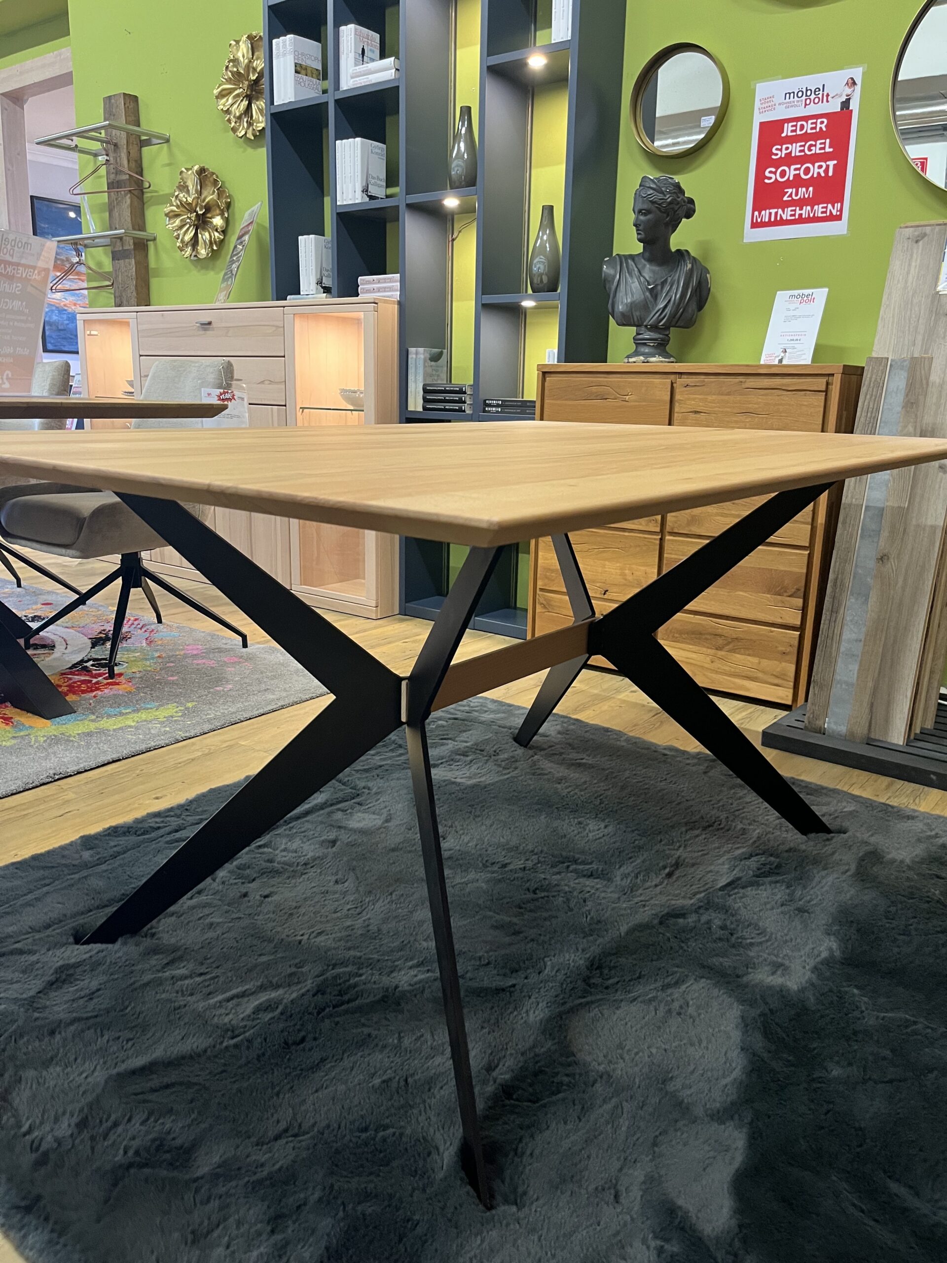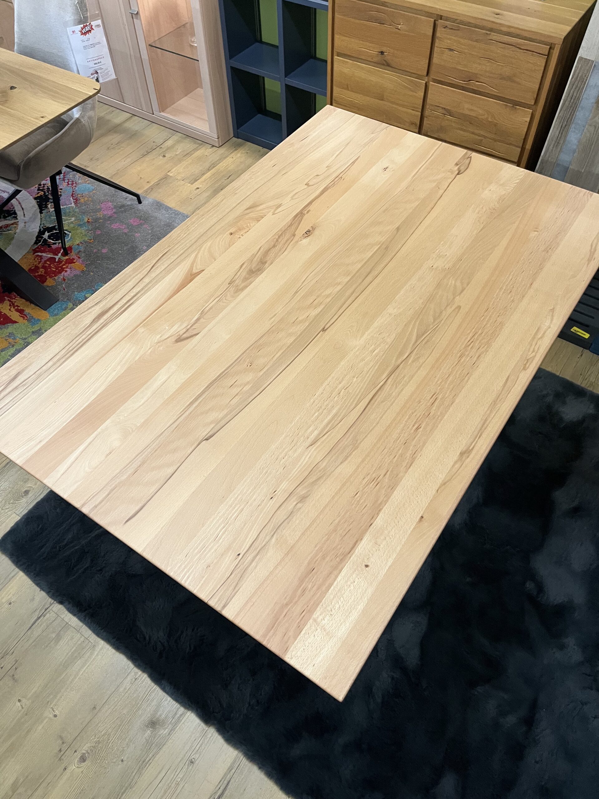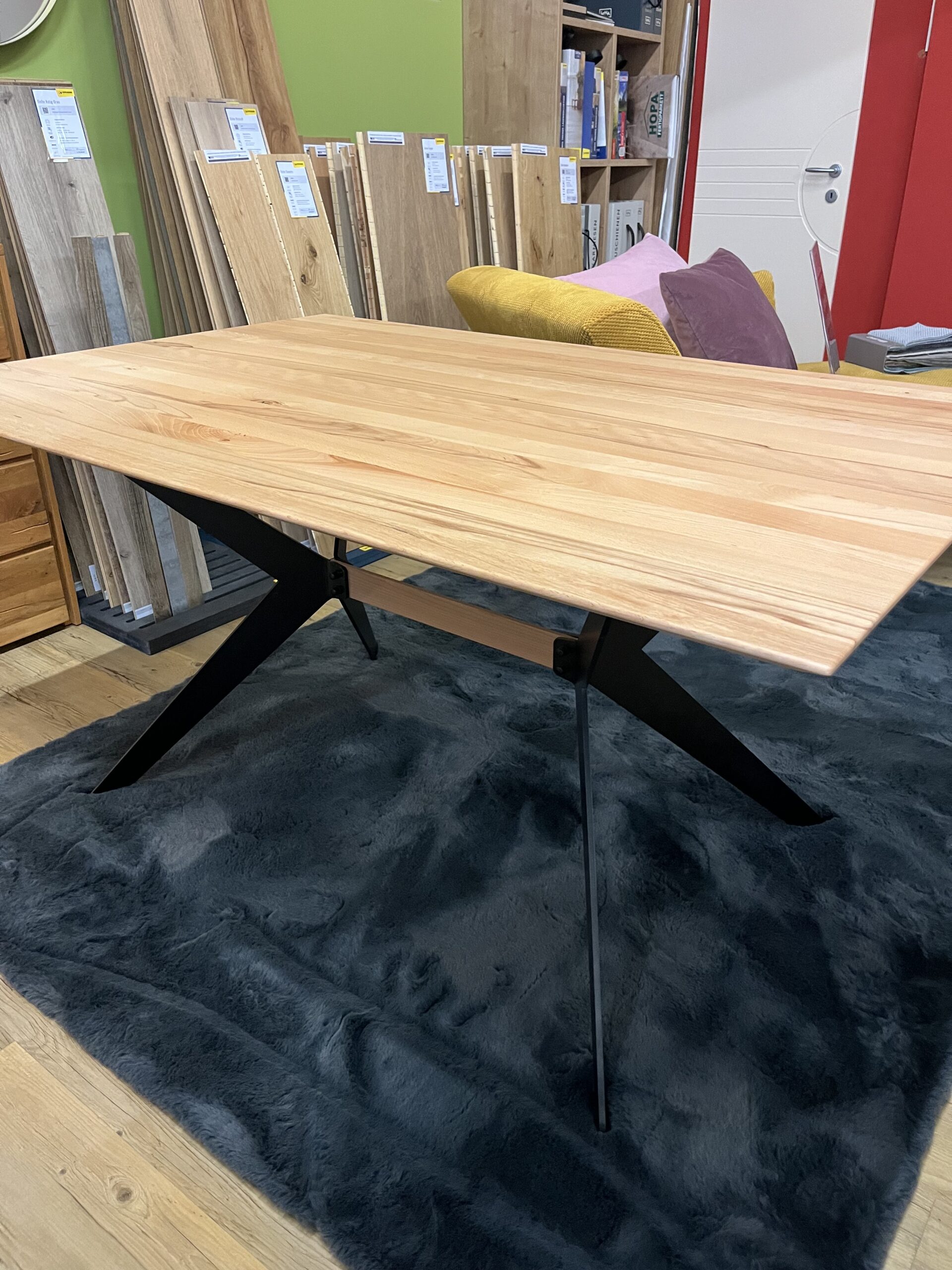 aus hauseigener Tischlerei, in Buche massiv natur lackiert, Metallgestell in schwarz matt, 150 x 100 cm