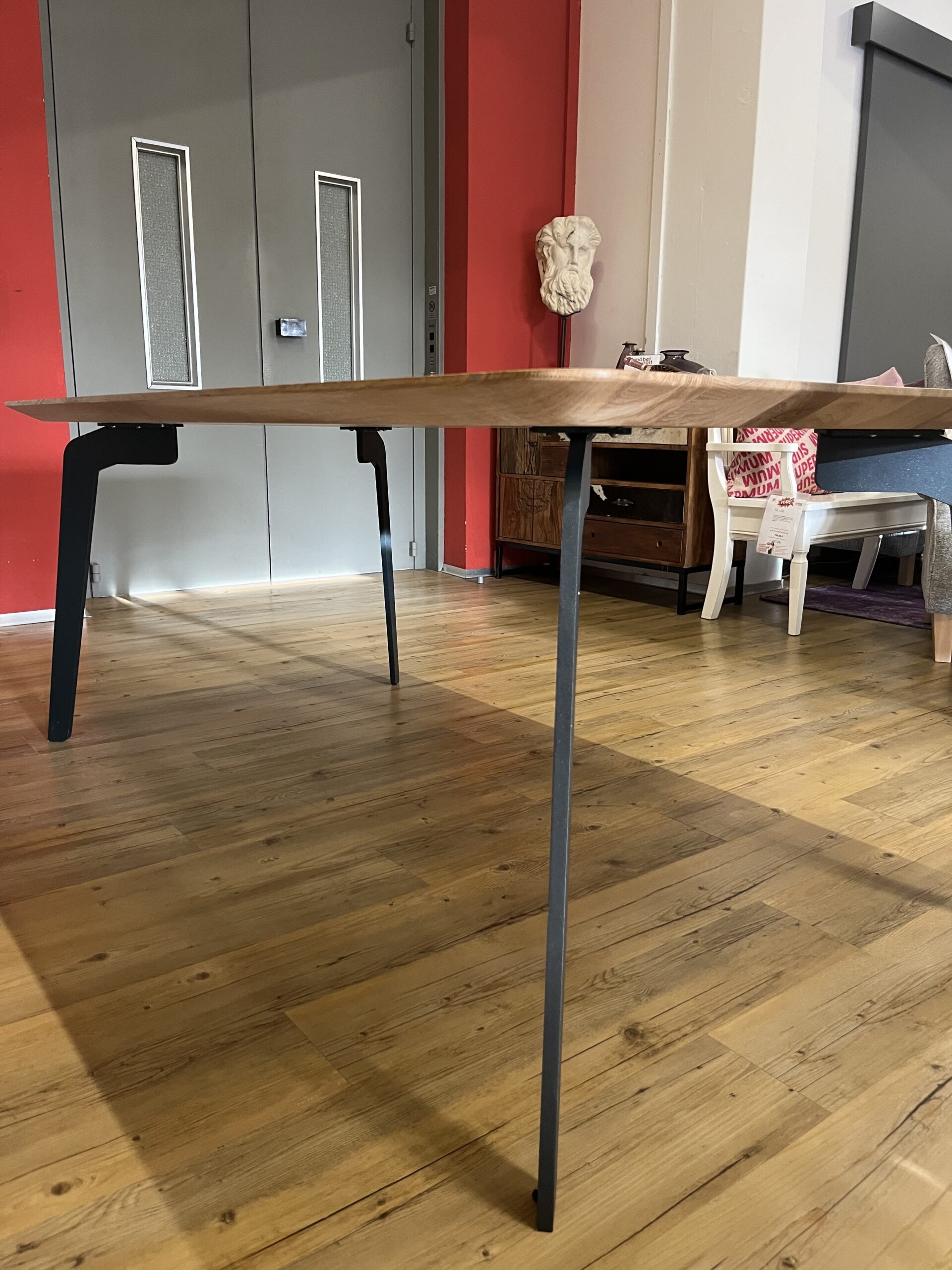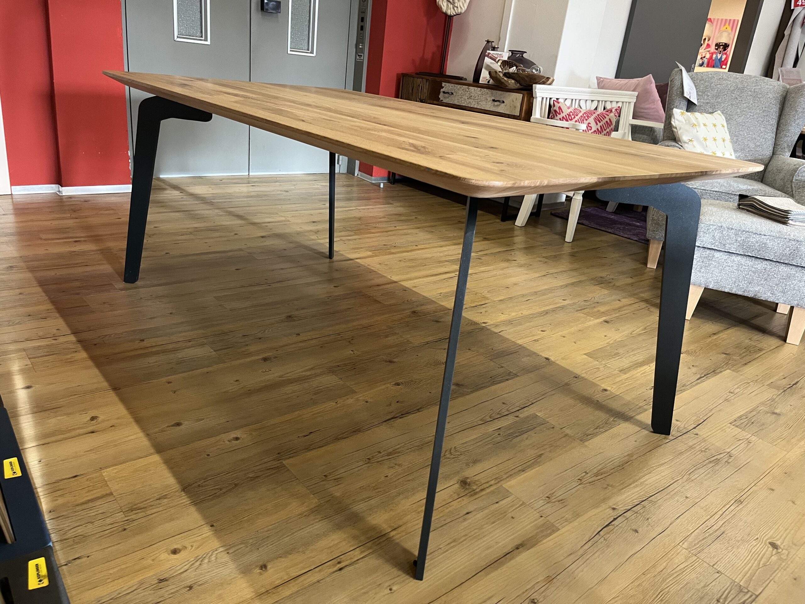 in Eiche massiv bianco geölt (Nr.51) mit Epoxyharz schwarz ausgekittet, Schweizer Kante gerundet, Platte 4cm stark, Lou Gestell pulverbeschichtet schwarz. Größe 180x100cm