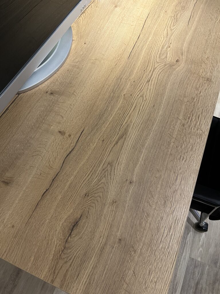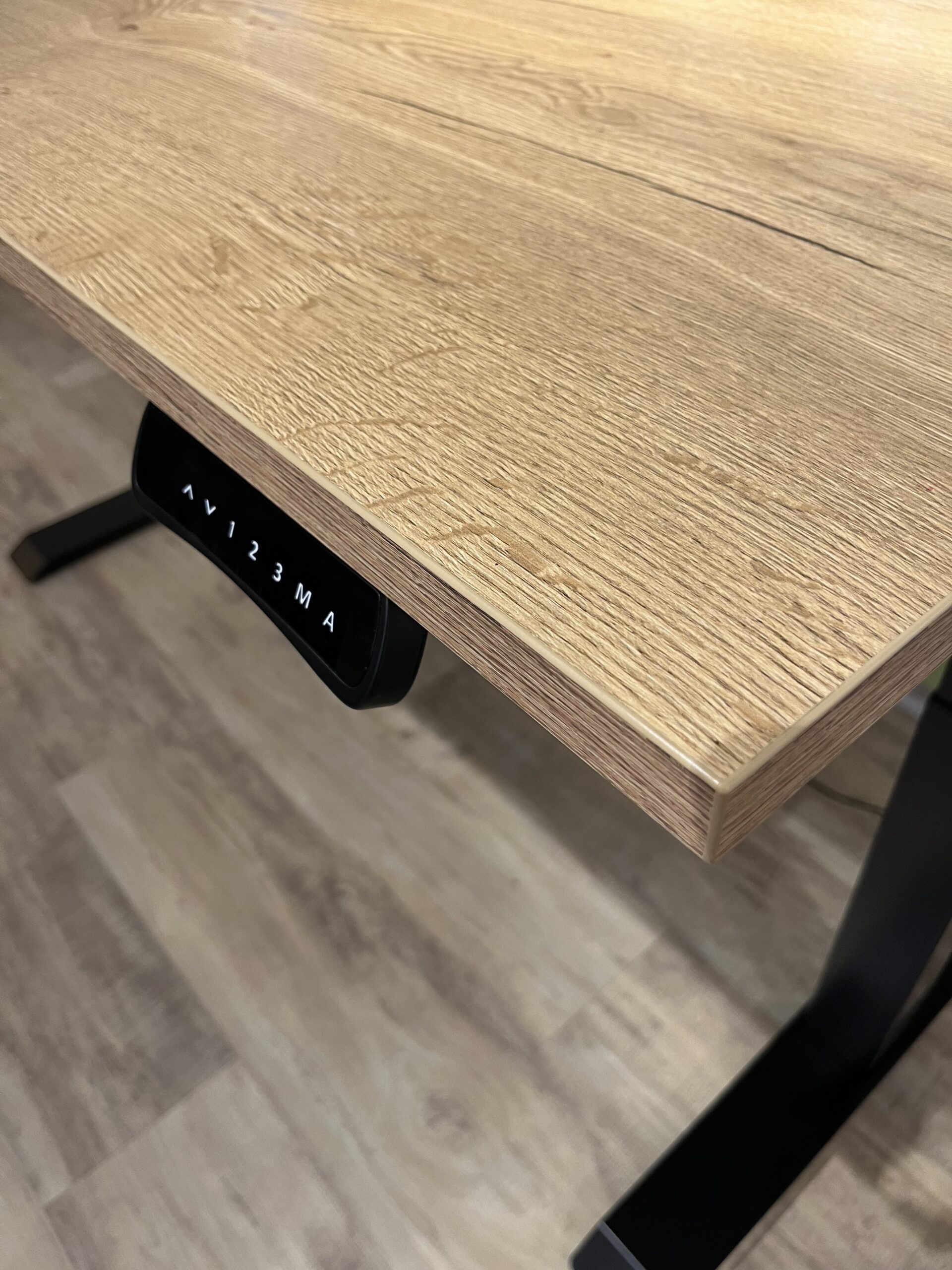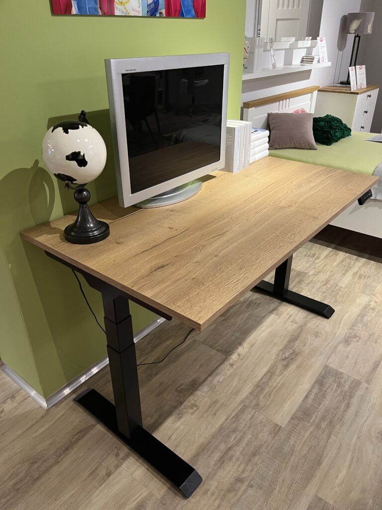 in moderner Goldeiche, 140 x 80 cm, Gestell in schwarz matt pulverbeschichtet, elektrisch stufenlos höhenverstellbar von 58 – 123 cm