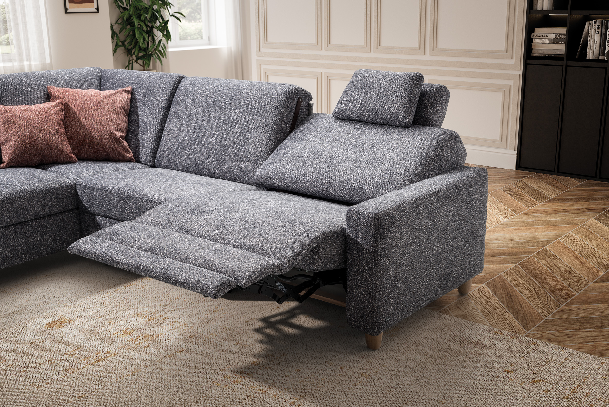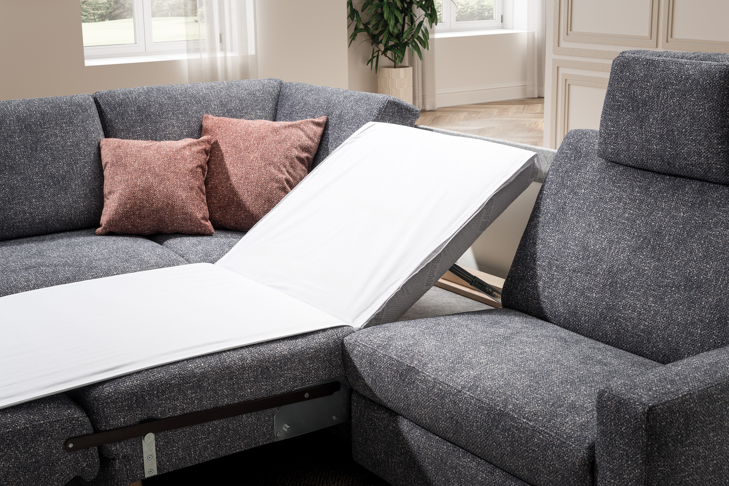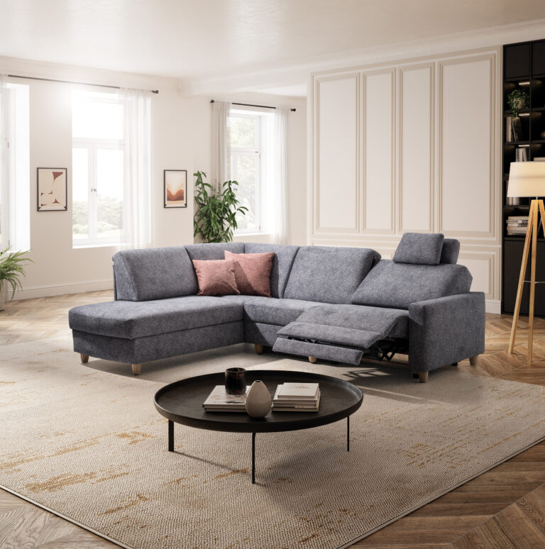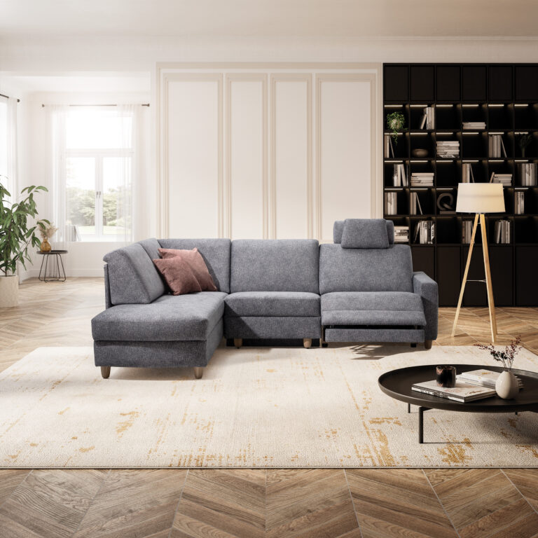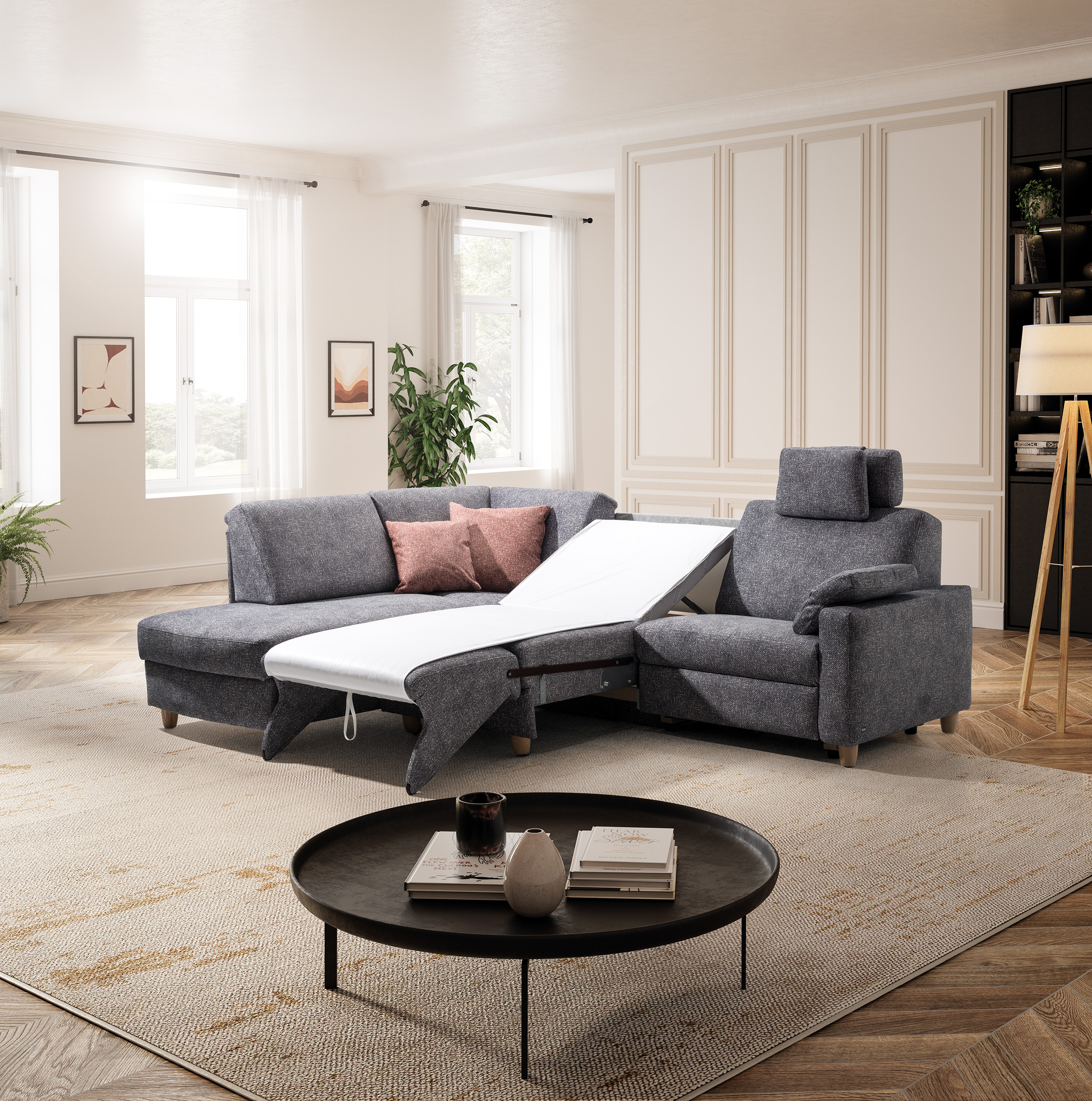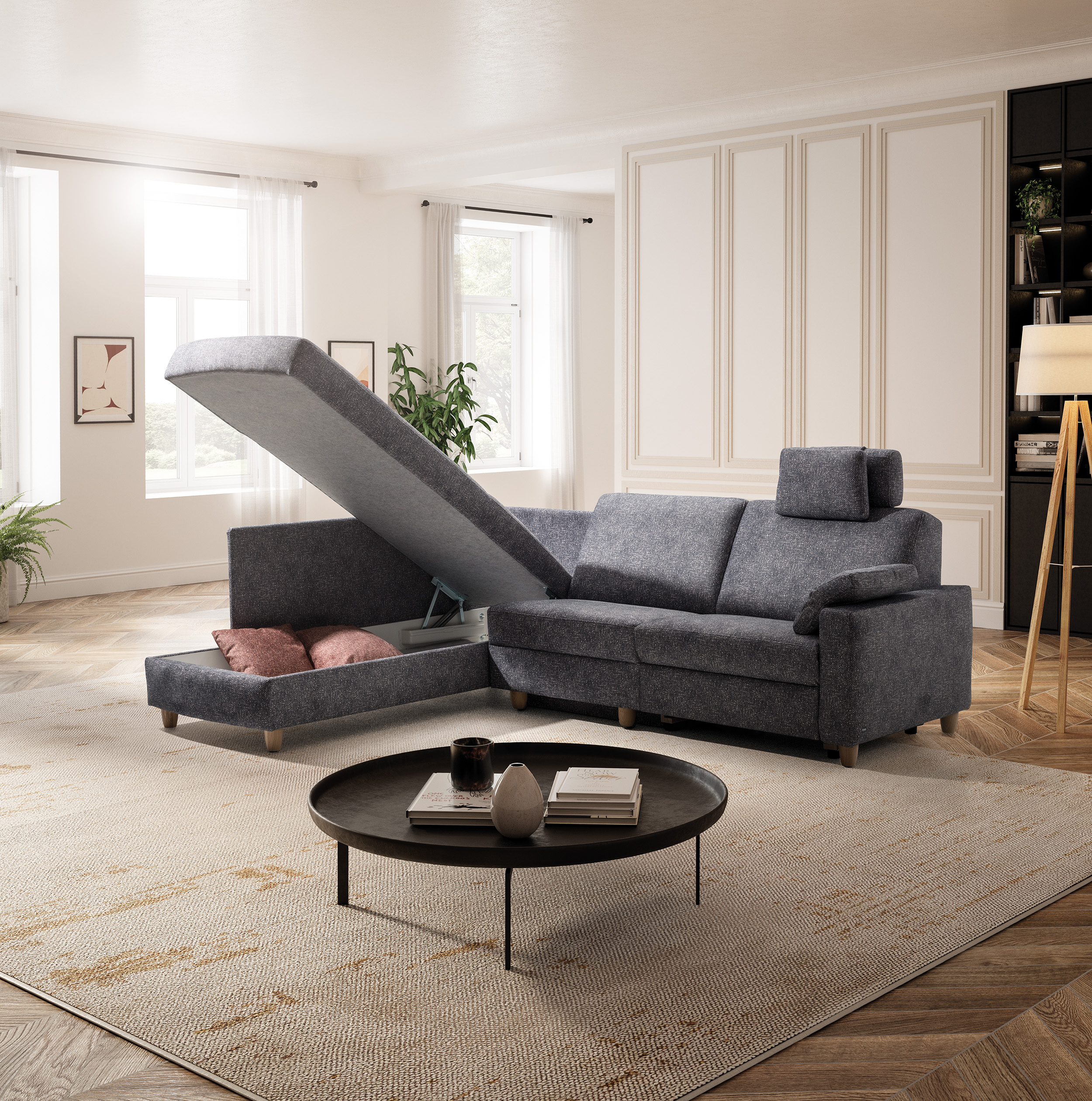 österreichische Qualität, flexibel Planbar, in hochwertigen Stoffbezug Luna, Sitzpolsterung in Federkern mit großem Stauraum, ca. 208 x 261 cm, Mehrpreis für Bettfunktion + 690.-, Kopfhochsteller + 79,-, Leintuch + 99,- , Relax Funktion + 829,-, Komfort-Kopfstütze + 219,-