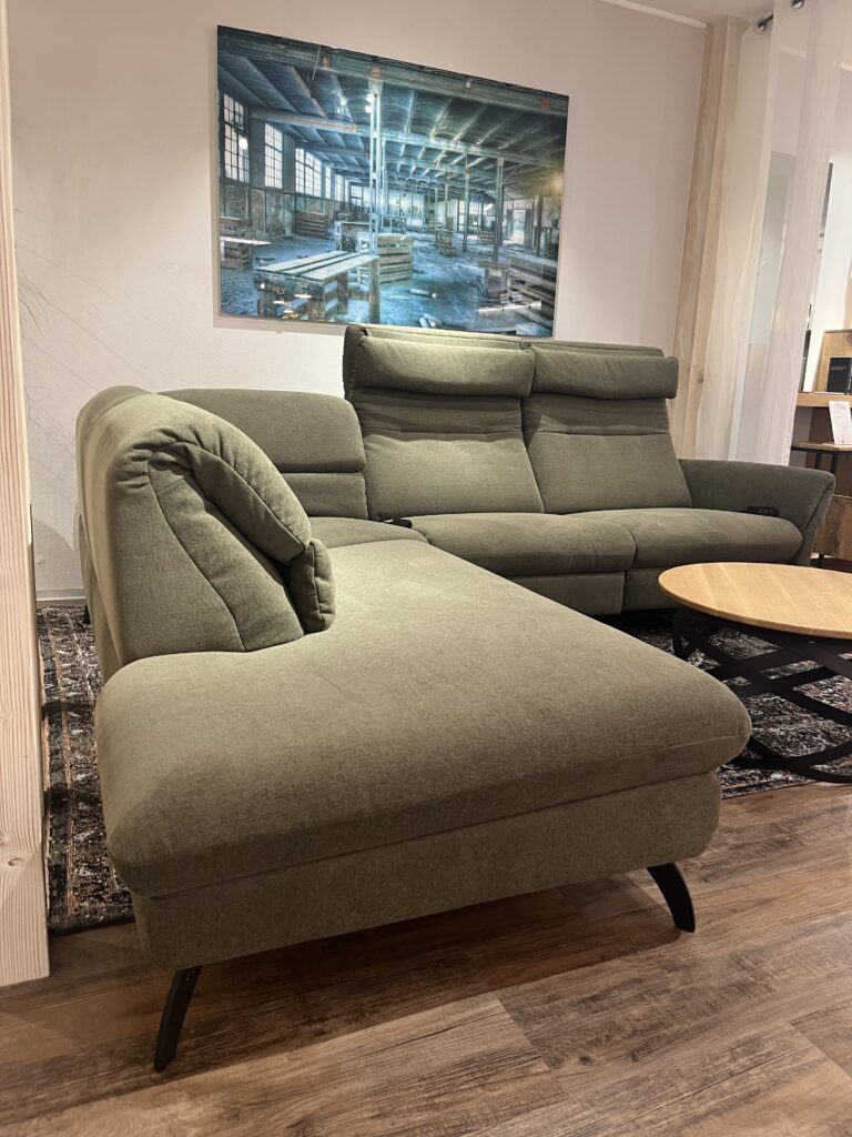 in pflegeleichtem Stoffbezug Easy Care, Farbe oliv, Metallfuß schwarz, Tonnentaschenfederkern im Sitz, 2x 2-motorische Relax Funktion mit Herz-Waage-Stellung, ca. 234 x 269 cm