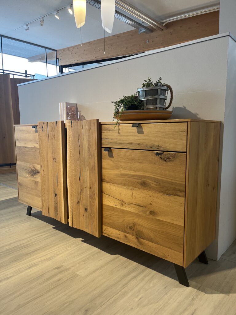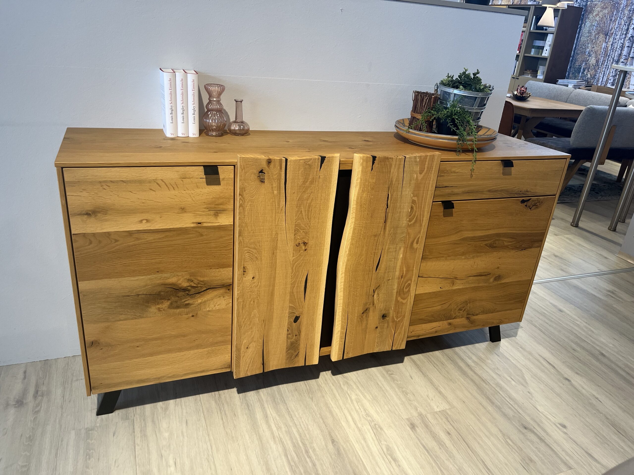in Balkeneiche massiv, Samtöl-Oberfläche, mit Designerfront Waldkante, schwarz gekittet, Griffe 35 und Füße in Metall schwarz matt, ca. 178 x 91 x 46 cm